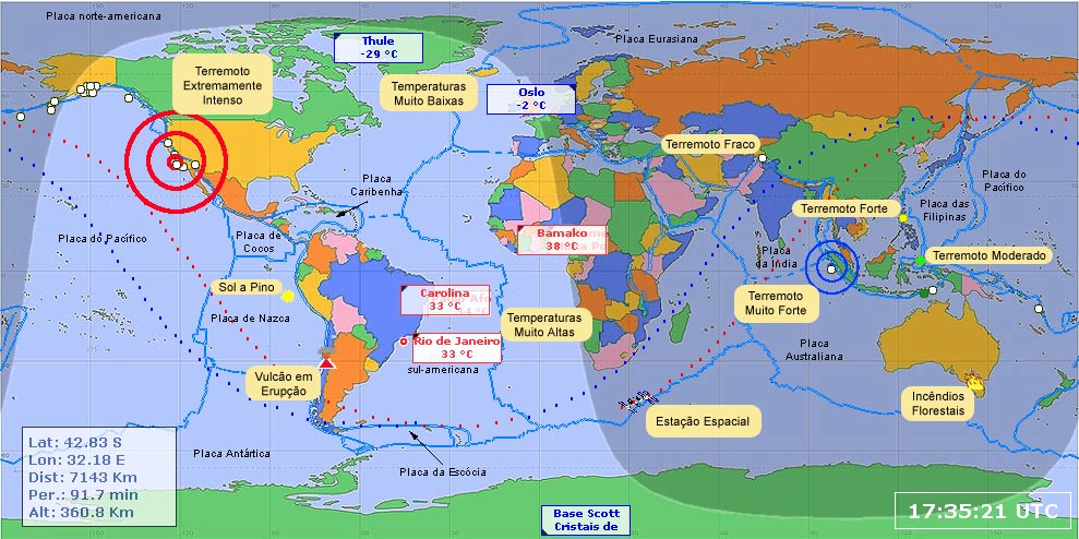Atualmente o Painel Global está capacitado a registrar todos os terremotos de pequena, média e grande intensidade que acontecem em qualquer parte do planeta, assim como as temperaturas recordes informadas por mais de 120 aeroportos que operam no Brasil e outros 350 ao redor do mundo. Vulcões, maremotos, tsunamis e furacões são constantemente monitorados pela nossa equipe e assim que informadas as coordenadas do evento são plotados e destacados no mapa. Nosso objetivo é fornecer um painel informativo de fenômenos naturais destinado às agências de notícias e ao público em geral, ávidos por informações geofísicas que possam ajudar no planejamento diário das diversas atividades, com destaque para viagens de negócios ou análises de risco aos empreendimentos próximos às áreas afetadas. O Painel Global não é um aplicativo fechado. Ele estará sempre em constante evolução para que possa representar com precisão todos os eventos naturais que ocorrem diariamente, mas que até agora eram mal divulgados ou dispersos através dos diversos sites e portais informativos brasileiros. Quando se olha o Painel Global pela primeira vez, a primeira coisa que vemos são duas grandes regiões claras e escuras. A zona clara representa as áreas da Terra iluminadas pelo Sol enquanto a zona escura mostra as regiões do planeta tomadas pela escuridão noturna. A linha imaginária que separa as duas regiões recebe o nome de "terminador", e é ela quem divide a Terra em dia e noite.