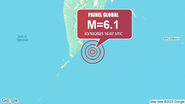 O Painel Global mostra um violento terremoto de 6.1 magnitudes ocorrido na Rússia, 181 km a sudeste de Vilyuchinsk às 16:07 UTC (03/10). O poderoso tremor teve seu hipocentro estimado a 19 km de profundidade, sob as coordenadas 51.63N e 160.01E. Considerando a magnitude e a baixa profundidade em que ocorreu o evento, este tremor tem potencial suficiente para causar pesados danos e vítimas fatais caso tenha ocorrido abaixo de locais populosos.