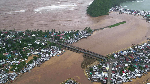 ![]() Imagem aérea na grande enchente em Tandang após a passagem da tempestade tropical Dujuan no fim de semana. Crédito: Foto Governador de Surigao del Sur, Alexander Pimentel. A tempestade Dujuan, batizada também localmente de Auring, provocou chuvas fortes e enchentes em vilas do sul do país e deslocou mais de cinco mil pessoas, segundo informações da agência de gestão e redução de risco de desastres do país. Na segunda-feira dezoito mil pessoas foram evacuadas e a eletricidade foi cortada em vários setores da província de Surigão do Sur, em Caraga, região de Mindanao. Dezenas de voos domésticos também foram cancelados e o mar agitado obrigou a suspensão das viagens de balsas pela costa leste das Filipinas. ![]() Dujuan provocou enchentes no sul e leste das Filipinas. Crédito: Imagem aérea divulgada pelo governador de Surigao del Sur, Alexander Pimentel. Desde o início as projeções indicavam que Dujuan não iria evoluir para um ciclone tropical e enfraqueceria para uma depressão tropical ao atravessar as Filipinas. Ainda assim, as extensão de danos especialmente pelas enchentes foram grandes. |
