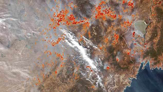 Satélite flagra incêndios e muita poeira no Extremo Oriente
