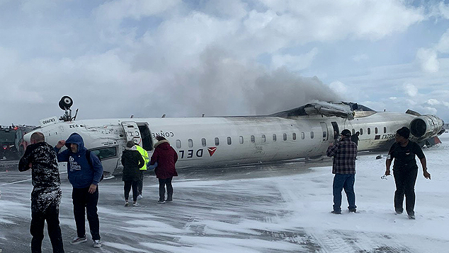 ![]() A aeronave da Delta capotou no aeroporto de Toronto. Ainda não estão claras as circunstâncias do acidente, segundo a polícia local. Crédito: RS/Fotos Públicas