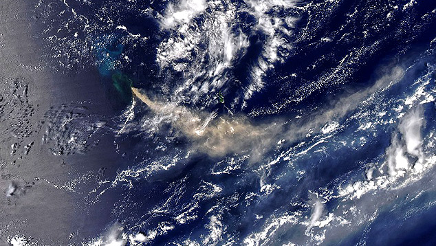 ![]() Imagem do satélite Aqua, da Nasa, mostra em cores reais, a grande nuvem de cinzas saindo do vulcão em Nishinoshima no último dia 3 de agosto. Crédito: Earthobservatory/NASA. Imagens recentes capturadas pelo satélite Aqua, da NASA, mostram em cores reais a extensa nuvem de cinzas que continua saindo da cratera do vulcão. Cientistas estimaram que a nuvem de cinzas atingiu, aproximadamente, 4900 metros acima do nível do mar no dia 3 de agosto. É um pouco mais da metade da altura da pluma observada no mês passado, em 4 de julho, quando chegou a 8300 metros no céu, a maior altitude das cinzas desde que Nishinoshima surgiu. A ilha vulcânica de Nishinoshima faz parte do arquipélago de Ogasawara, no Pacífico, um arco de ilhas vulcânicas localizadas a cerca de mil quilômetros de Tóquio, no Japão. ![]() Imagem do satélite Aqua, da Nasa, mostra grande atividade do vulcão em Nishinoshima, no dia 4 de julho. A nuvem de cinzas atingiu 8300 metros no céu, a maior altitude desde que a ilha vulcânica surgiu em 2013. Crédito: Earthobservatory/NASA