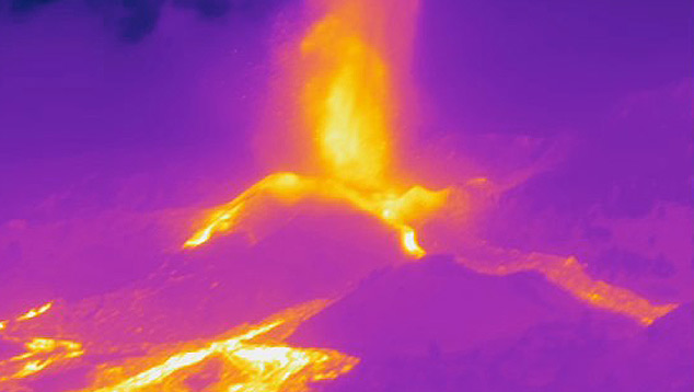 Técnicos do Instituto Vulcanológico das Canárias (INVOLCAN) conseguiram hoje uma impressionante imagem revelando o contraste térmico e as fontes de lava claramente visíveis saindo do vulcão Cumbre Vieja, na ilha de La Palma, nas Canárias. Os fluxos de lava ainda não atingiram o mar como o esperado e autoridades estão em alerta para os riscos envolvidos.