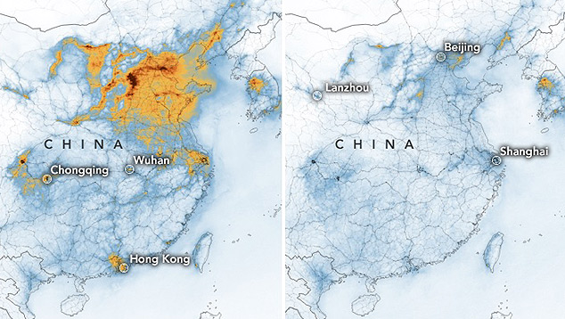 Normalmente na lista dos países mais poluídos do mundo, a China vê agora seu nível de poluição despencar e há evidências de que a mudança possa estar relacionada à desaceleração econômica por conta do avanço novo coronavírus (COVID-19). Satélites de monitoramento de poluição da NASA e da ESA revelaram que o nível de dióxido de nitrogênio caiu significativamente.