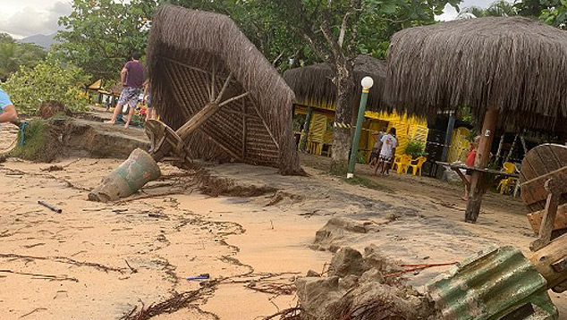 ![]() Destruição em Ubatuba com forte ressaca no domingo de carnaval. Crédito: Imagem divulgada pelo twitter @Claudiadabreu12 A situação foi mais grave no litoral norte paulista. Banhistas na praia do Tenório, em Ubatuba relataram muita confusão e pânico no momento que o mar avançou, por volta do meio dia do domingo. Pelo menos seis pessoas ficaram feridas e houve grande prejuízo aos comerciantes da orla, segundo o Grupamento de Bombeiros Marítimos. As informações são de que as ondas em alto mar passaram de 3 metros. Veja imagens da ressaca invadindo a praia do Tenório, em Ubatuba, divulgadas no youtube: O calçadão na parte central de Ubatuba, na região do Aquário, foi novamente destruído também atingido pela ressaca. O mar avançou com força e provocou destruição também em praias de Caraguatatuba, São Sebastião, Ilhabela, litoral norte e em Santos, no litoral sul paulista.