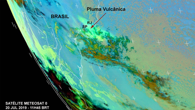 ![]() A imagem do satélite METEOSAT mostra a pluma vulcânica entre a costa de São Paulo e do Rio de Janeiro, que está avançando em direção ao mar. As correntes de vento são as responsáveis por trazer a nuvem de cinzas até o Brasil. Ela pode causar transtornos ao transporte aéreo, mas é pouco visível a população, pois está em grande altitude. Veja como foi a erupção do Vulcão Ubinas, no Peru: